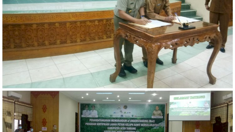 Aceh Tamiang [Aceh], Bupati Aceh Tamiang Mursil, SH, M.Kn bersama Plt. Kakanwil BPN Provinsi Aceh Melaksanakan Penandatanganan Memorandum of Understanding (MoU) Program Sertifikasi Lahan Petani Kelapa Sawit Berkelanjutan Kabupaten Aceh Tamiang, bertempat di Aula Setdakab Aceh Tamiang, pada Senin (13-09).