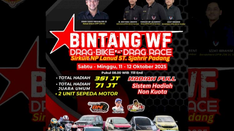 PADANG, RedaksiDaerah.com – Ajang balap bergengsi bertajuk BINTANG WF Drag Bike – Drag Race akan digelar di Sirkuit NP Lanud ST. Sjahrir Padang pada Sabtu–Minggu, 11–12 Oktober 2025. Event ini menjanjikan persaingan sengit para pembalap motor dan mobil dari berbagai daerah, memperebutkan total hadiah spektakuler senilai 351 juta rupiah, termasuk hadiah juara umum sebesar 71 juta rupiah dan 2 unit sepeda motor.