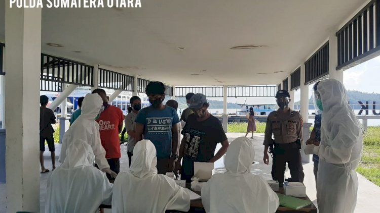 NIAS SELATAN | Dalam rangka upaya antisipasi pencegahan penyebaran Virus Corona (COVID 19) di Wilkum Perairan Polres Nias Selatan, personil Sat Binmas Polres Nias Selatan melaksanakan imbauan kepada penumpang KM Mentawai Fast di Pelabuhan Telukdalam, Nias Selatan, Sabtu (29/8/2020) sekira pukul 10.00 WIB.