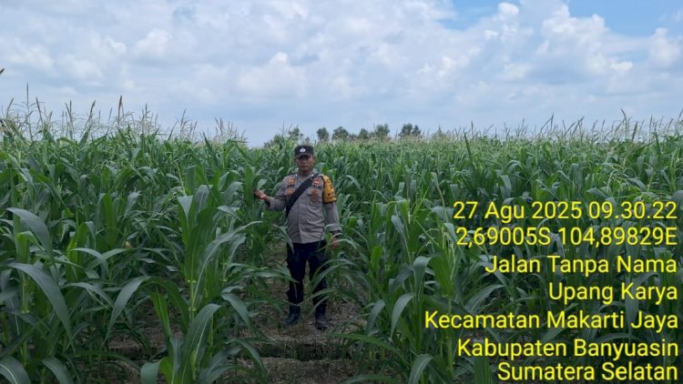 Bintara Keamanan Dan Ketertiban Masyarakat (Bhabinkamtibmas) Polsek Muara Telang Brigpol Arif Abdullah, memeriksa lahan jagung untuk memantau pertumbuhan tanaman, memastikan tidak ada hama atau gangguan.