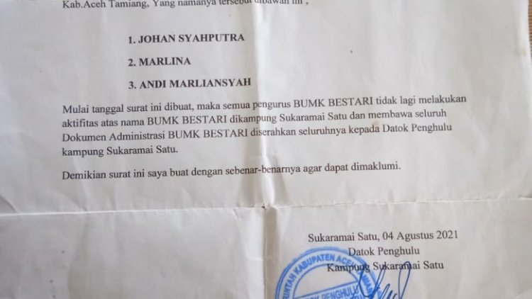 Aceh Tamiang[Aceh], Pemberhentian pengurus BUMK secara sepihak terindikasi adanya upaya datok untuk menguasai aset BUMK yang selama ini telah ada sejak adanya kucuran dana BUMK di Desa Sukaramai Satu Kecamatan Seruway.