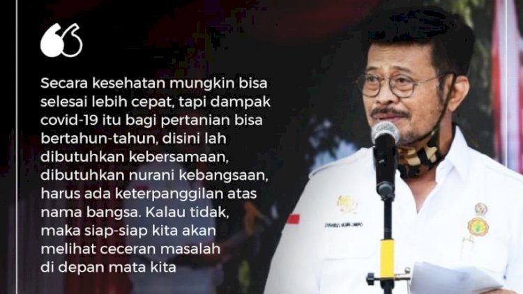 “Secara kesehatan mungkin bisa selesai lebih cepat, tapi dampak covid-19 itu bagi pertanian bisa bertahun-tahun, disinilah dibutuhkan kebersamaan, dibutuhkan nurani kebangsaan, harus ada keterpanggilan atas nama bangsa. Kalau tidak, maka siap-siap kita akan melihat ceceran masalah di depan mata kita,” demikian kutipan kalimat Menteri Pertanian.