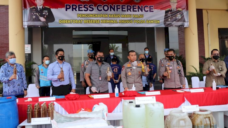 Serang |Banten| - Ditreskrimsus Polda Banten Gelar Press Conference hasil ungkap kasus Madu yang tidak memiliki standar keamanan pangan atau Madu palsu di Mapolda Banten, Selasa (10/11/20).