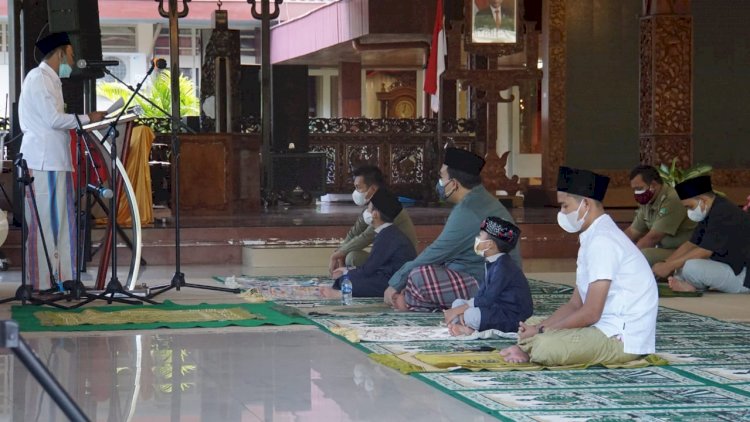 Bupati bersama keluarga melaksanakan sholat ied di Pendopo Rumah nya, dengan mematuhi protokol kesehatan. Sholat ied dilaksanakan mulai pukul 06.50 WIB dengan imam dan khatib KH. Ahmad Labib Hilmy, Selasa (20/7/2021).