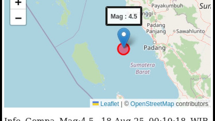 Pariaman, RDG – Gempa bumi dengan kekuatan magnitudo 4,5 mengguncang wilayah barat daya Pariaman, Sumatera Barat, pada Senin dini hari (18/8/2025) pukul 00.10 WIB.