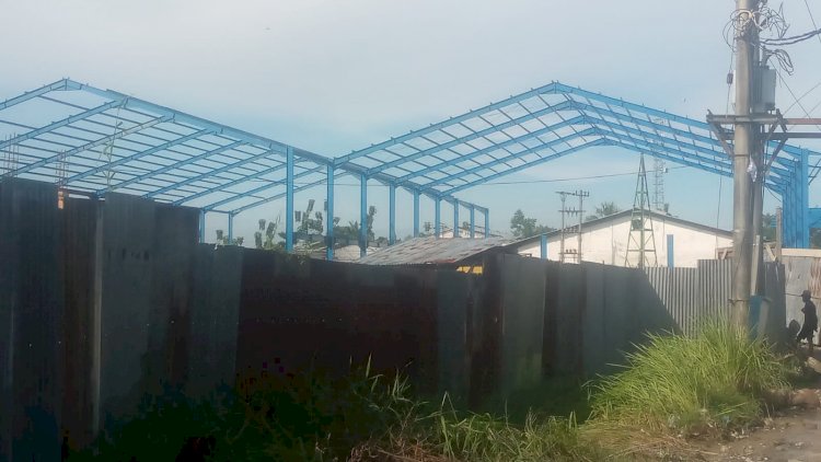Melihat situasi di lokasi bangunan, ada beberapa alat berat seperti Beko sedang beroperasi di dalam kawasan rangka baja yang ditutupi seng tersebut. Tampak sejumlah pekerja sedang memasang batu pagar jalan speksi ke dalam gudang, besi untuk kerangka baja atap bangunan.