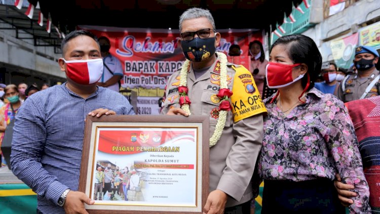 Selain itu Kapolda Sumut juga turut di berikan cendera mata olah Ketua Persatuan Pedagang pasar tradisional Kota Medan sekaligus menobatkan Irjen Pol Martuani Sormin sebagai Bapak pedagang pasar tradisional Kota Medan.