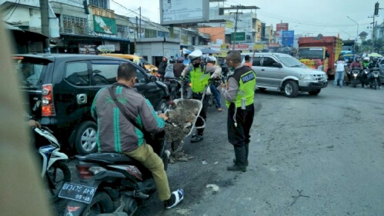 Keduanya terlihat dengan menggunakan gerobak sorong mengangkat pecahan batu-batu kecil untuk menimbun jalan yang rusak dan berlubang di persimpangan Jalan Sei Mencirim - Jl. Binjai Sunggal. Hal ini menjadi perhatian pengguna jalan yang melintas. Terlihat warga yang kebetulan melintas mengacungkan jempol sembari mengatakan mantap kepada Polantas.