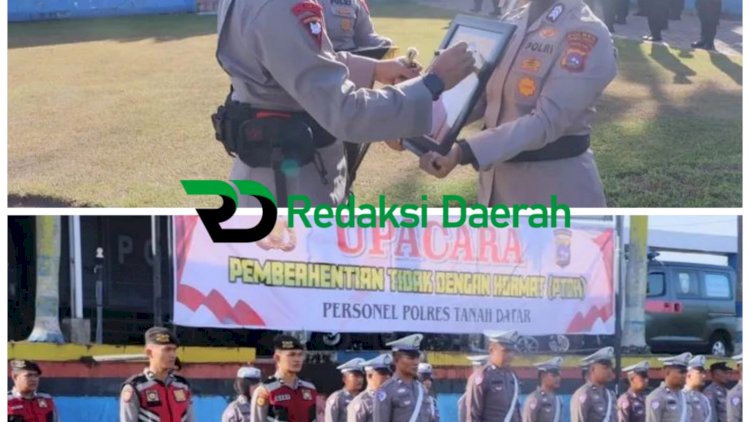 Tanah Datar – RedaksiDaerah.com — Polres Tanah Datar menggelar upacara Pemberhentian Tidak Dengan Hormat (PTDH) terhadap salah seorang anggotanya, Briptu YP. Upacara berlangsung khidmat namun penuh ketegasan, dipimpin langsung oleh Kapolres Tanah Datar, AKBP Dr. Nur Ichsan Dwi Septiyanto, S.H., S.I.K., M.I.K., di lapangan apel Mapolres Tanah Datar, Senin (25/8).