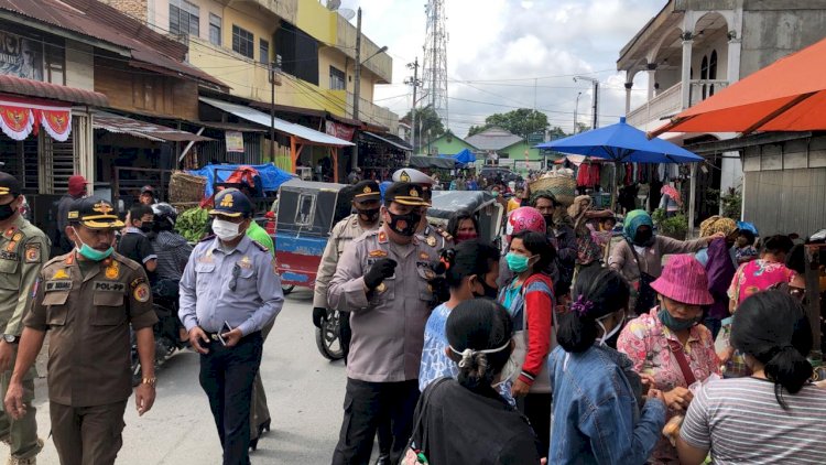 Humbahas |Sumut| - Polres Humbang Hasundutan (Humbahas) bersama Koramil, Dishub, Satpol PP, dan Dinas Kesehatan, menyambangi Pasar Tradisional di Kecamatan Dolok Sanggul, Kabupaten Humbahas, Sumatera Utara, Jum'at (28/08/20).