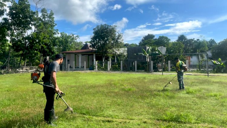 Karya bakti tersebut difokuskan pada pembersihan halaman gereja, termasuk pemangkasan rumput liar dan penataan lingkungan sekitar. Personel Satgas bersama warga setempat bergotong royong menciptakan lingkungan gereja yang bersih, rapi, dan nyaman untuk digunakan dalam kegiatan peribadatan.