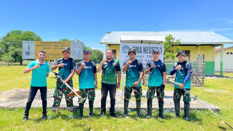 Kupang - Satgas Pamtas RI–RDTL Sektor Barat Yonarhanud 2 Kostrad Pos Oepoli Tengah melaksanakan kegiatan karya bakti bersama berupa pembersihan dan pemotongan rumput di SMAN 1 Amfoang Timur, Desa Netemnanu Utara, Kec. Amfoang Timur, Kabupaten Kupang, Rabu (04/02/2026).