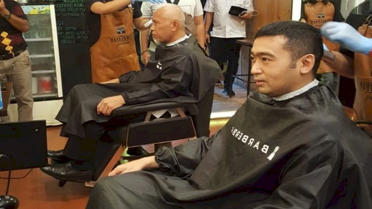PADANG (SUMBAR) - Pasangan Bakal Calon Wakil Gubernur Sumbar, Audy Joinaldy dan Bakal Calon Gubernur Sumbar, Mahyeldi Ansharullah kompak memotong rambut secara bersamaan di salah satu tempat pangkas di Kota Padang. Dua sosok tersebut tampil dengan potongan rambut baru dan terlihat lebih fres sebelum mengisi kegiatan Rapat Koordinasi Persiapan Pilkada di Hotel Bumi Minang, Rabu (1/7/20).