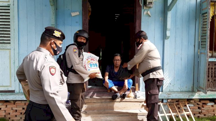 Jumat, 04 Desember 2020 pagi, Polisi memberikan bantuan paket sembako dikediaman Zamzami (53) Jalan Tugu Pulau, RT 06/RW 02, Desa Melayu Besar, Kecamatan Tanah Putih Tanjung Melawan, Kabupaten Rokan Hilir (Rohil), Provinsi Riau.