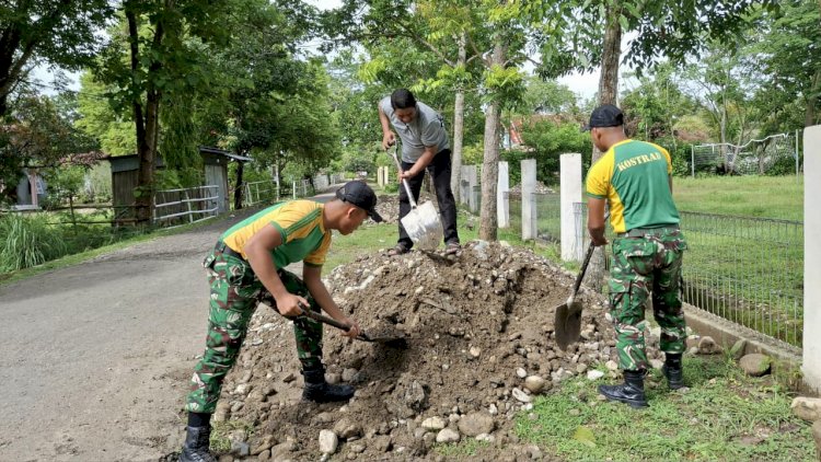 Belu, RedaksiDaerah.com - Satgas Pamtas RI–RDTL Sektor Timur Yonarmed 12 Kostrad melaksanakan kegiatan pemerataan tanah di jalan sekitar Gereja Katolik St. Maria Bunda Penebus Fatuketi, Desa Umanen, Kecamatan Atambua Barat, Kabupaten Belu, Nusa Tenggara Timur. Kegiatan ini dilaksanakan dalam rangka persiapan menyambut perayaan Natal, Selasa (23/12/2025).