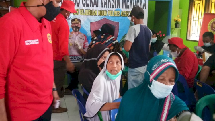 Personil Posda Aceh Tamiang mengatakan "Kegiatan vaksinasi ini bekerjasama dengan unsur Forkopimcam Kejuruan Muda, TNI serta Polri.