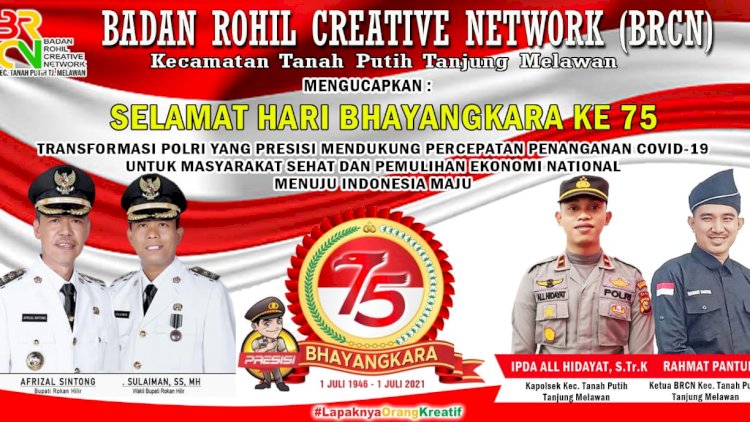 Rokan Hilir– Memperingati HUT (hari ulang tahun) Bhayangkara yang ke-75, tepatnya pada tanggal 1 Juli 2021. Pengurus Badan Rohil Cereatif Network (BRCN) Kecamatan Tanah Putih Tanjung Melawan Kabupaten Rokan Hilir Provinsi Riau mengucapkan selamat untuk Kepolisian Negara Republik Indonesia (Polri).