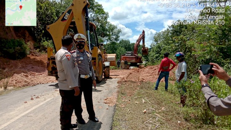 Kapolres Kuantan Singingi didampingi Kabag Ops dan Kasat Lantas meninjau lokasi terjadinya tanah longsor di desa pulau Kedundung dan langsung memberikan arahan dan petunjuk kepada personel Polri dan pegawai PUPR yang ada di lokasi tersebut.