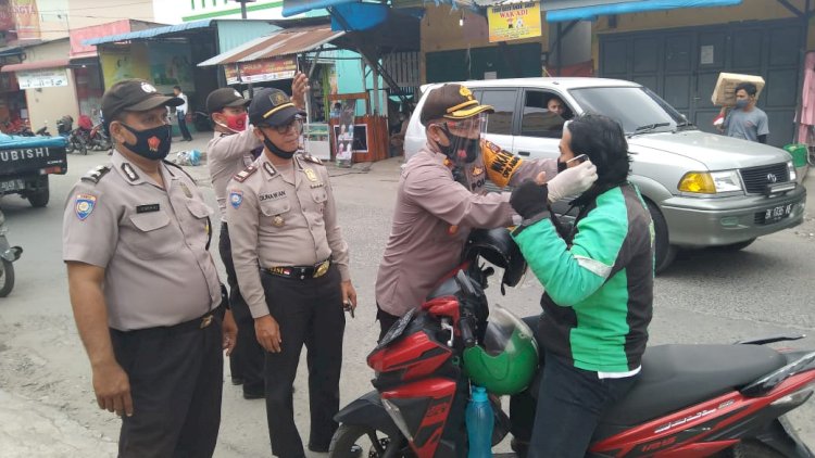 Kapolres Pelabuhan Belawan diwakili Wakapolres Pelabuhan Belawan Kompol Herwansyah Putra, SH., MSi memimpin langsung pelaksanaan kegiatan Rabu (28/08/20) di Jalan Rumah Potong Hewan Kelurahan Mabar, Kecamatan Medan Deli dengan sasaran para pengendara roda dua maupun roda empat yang tidak menaati protokol kesehatan.