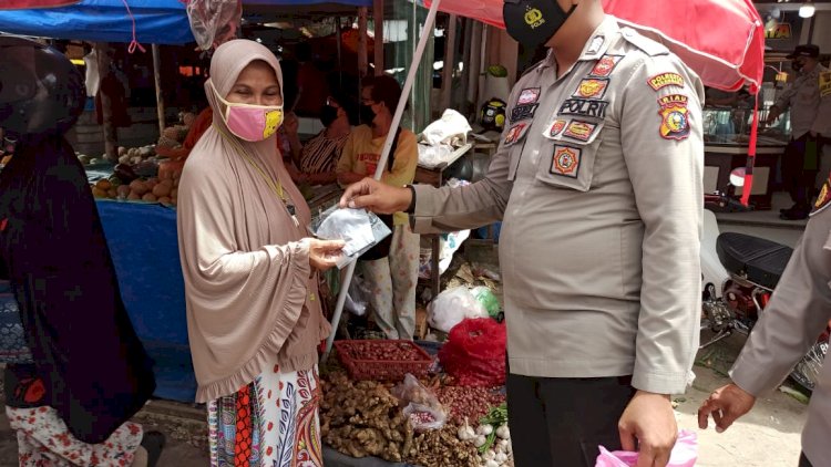 Hal yang sama juga dilakukan Personel Polsek Bukit Raya memberikan masker kepada pedagang dan pengunjung di sekitaran Pasar Pagi Arengka Kelurahan Sidomulyo Timur Kecamatan Marpoyan Damai Kota Pekanbaru sebanyak 100 pcs dengan sasaran Kios Pakaian dan Barang Pecah Belah serta pengunjung Pasar Pagi Arengka Jalan Soekarno Hatta Pekanbaru.