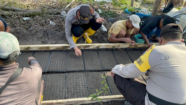 " Giat Penyemaian Bibit Semangka dan Pemasangan Mulsa di Ketahanan Pangan Kampung Tangguh Nusantara Polsek TPTM. selama giat berlangsung, situasi aman dan kondusif.