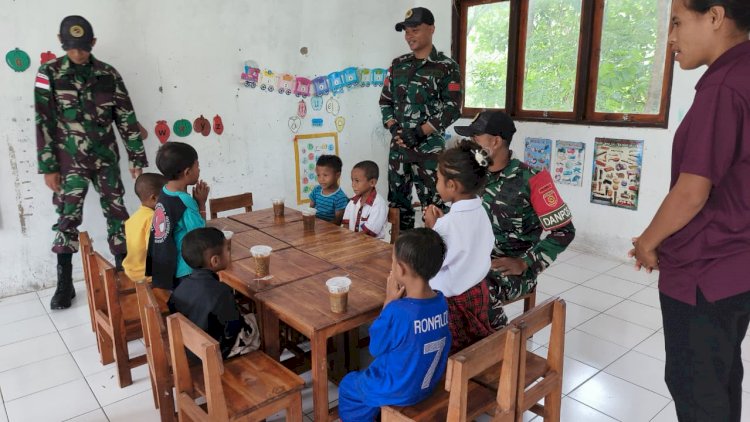 Belu, RedaksiDaerah.com - Satgas Pamtas RI–RDTL Sektor Timur Yonarmed 12 Kostrad melalui Pos Fatubesi Atas melaksanakan kegiatan pembagian bubur kacang hijau kepada anak-anak PAUD di Desa Takirin, Kecamatan Tasifeto Timur, Kabupaten Belu. Kegiatan ini merupakan bentuk kepedulian prajurit terhadap kesehatan dan pemenuhan gizi anak-anak di wilayah perbatasan, Rabu (11/02/2026).