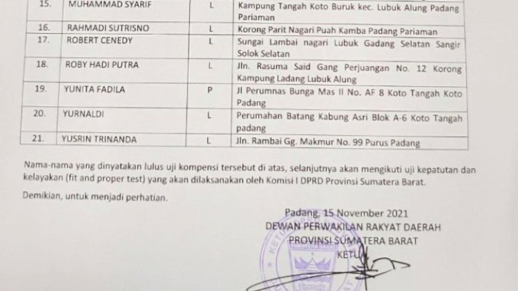 Padang, Redaksidaerah.com - Hasil Seleksi uji kompetensi Calon Anggota Komisi Penyiaran Indonesia Daerah Sumatera Barat (KPID Sumbar) baru saja diumumkan secara resmi. Hal ini tahapan seleksi sudah di tingkat Komisi I DPRD Provinsi Sumbar, Jum'at (12/11/21).