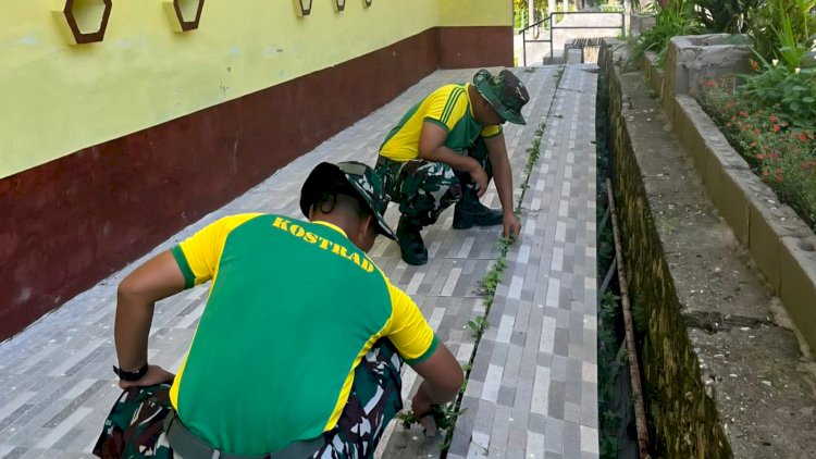 Personel Satgas secara bergotong royong melaksanakan pembersihan halaman gereja dan selokan yang dipenuhi rumput liar. Dengan peralatan sederhana, anggota pos bekerja bersama warga untuk menata lingkungan gereja agar lebih bersih, nyaman, dan layak digunakan untuk berbagai kegiatan keagamaan. Kehadiran personel Satgas juga menambah semangat warga yang turut terlibat dalam kegiatan tersebut.