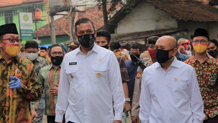 BEKASI ( JABAR) - Wakil Walikota Bekasi Tri Adhianto bersama Sekretaris Camat Pondok Melati, Lurah Jatiwarna, Satuan Polisi Pamong Praja, Dinas Perhubungan Kota Bekasi mengitari Pasar Kecapi, Kamis(18/6/20).. Tri dan rombongan ingatkan masyarakat agar selalu pakai masker mencuci tangan dengan handsanitaizer di saat berada di pasar.