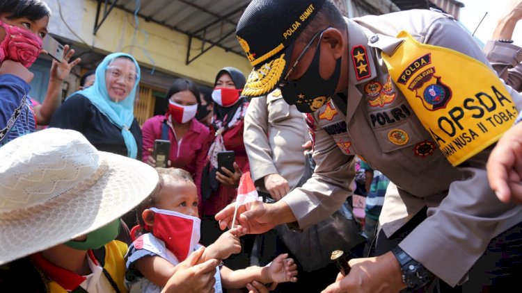 Usai mensosialisasikan protokol kesehatan, Kapolda Sumut kemudian memberikan bantuan sembako kepada warga sekitar maupun para pedagang.