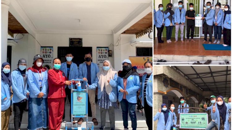 Riau-Kuliah Kerja Nyata (KKN) Balek Kampung Universitas Riau Posko Tangkerang Barat RW 4 Pekanbaru melakukan penyerahan Handsanitizer dengan sistem injak ke Kantor Lurah Tangkerang Barat(2/08).