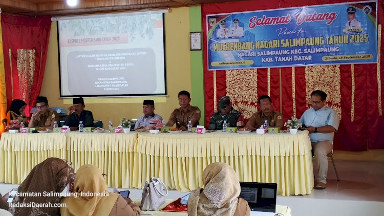 Tanah Datar — RedaksiDaerah.com — Musyawarah Perencanaan Pembangunan (Musrenbang) Nagari Salimpaung tahun 2025 resmi digelar di aula kantor Walinagari Salimpaung, Senin (15/9/2025). Agenda penting ini membahas daftar usulan rencana kerja pemerintah (DURKP) Nagari Salimpaung tahun anggaran 2027 dan rencana kerja pemerintah (RKP) tahun anggaran 2026 sebagai acuan pembangunan nagari ke depan.