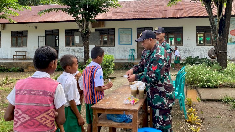 Belu, RedaksiDaerah.com - Satgas Pamtas RI–RDTL Sektor Timur Yonarmed 12 Kostrad melalui Pos Maubusa melaksanakan kegiatan pembagian bubur kacang hijau kepada siswa-siswi SD Beitaus yang berlokasi di Asumanu, Kecamatan Raihat, Kabupaten Belu, Nusa Tenggara Timur, Senin (2/2/2026). Kegiatan ini merupakan bentuk kepedulian TNI terhadap pemenuhan gizi anak-anak sekolah di wilayah perbatasan RI–RDTL.
