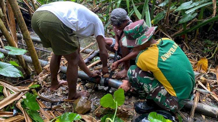 Karya bhakti berupa pembersihan jalur sumber air dilaksanakan setelah adanya laporan masyarakat terkait tersendatnya aliran air menuju pemukiman selama beberapa hari. Personel bersama warga bergotong royong membersihkan saluran agar air dapat kembali mengalir dengan lancar untuk memenuhi kebutuhan sehari-hari.