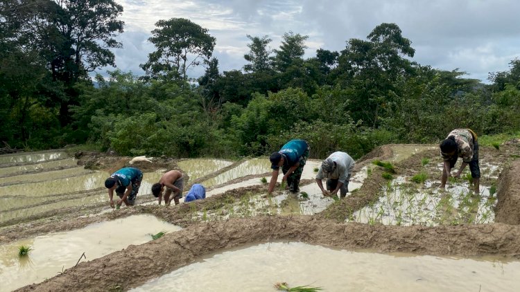 Kehadiran personel Pos Laktutus disambut antusias warga yang bersama-sama turun ke sawah untuk mempercepat proses tanam. Semangat kebersamaan terlihat jelas, mencerminkan kemanunggalan TNI dengan rakyat dalam mendukung sektor pertanian lokal.